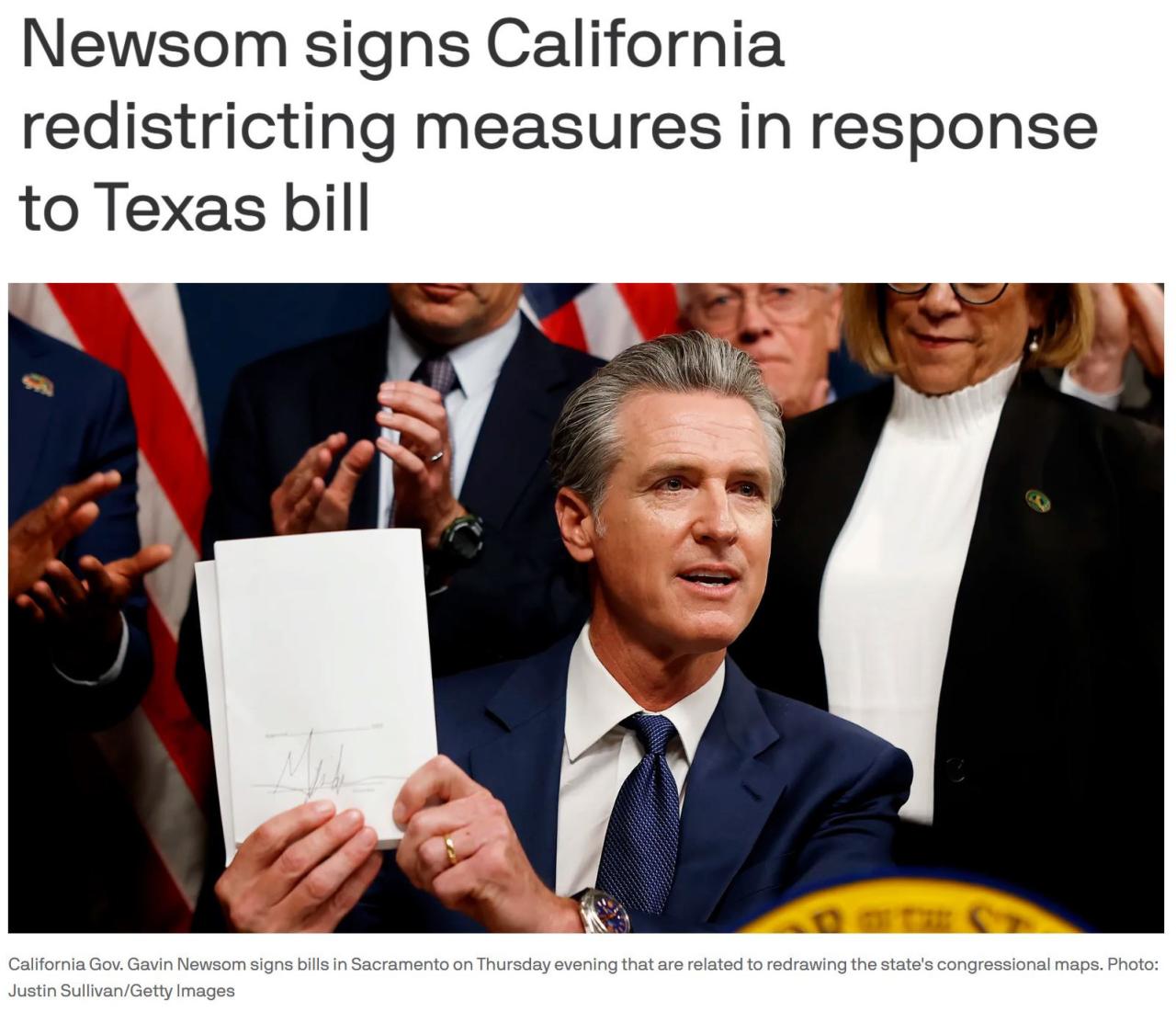 纽森随后签署相关决议案,确定于11月4日举行全州特别投票。加州此举旨在对冲由共和党掌控的得克萨斯州发起的类似举措。