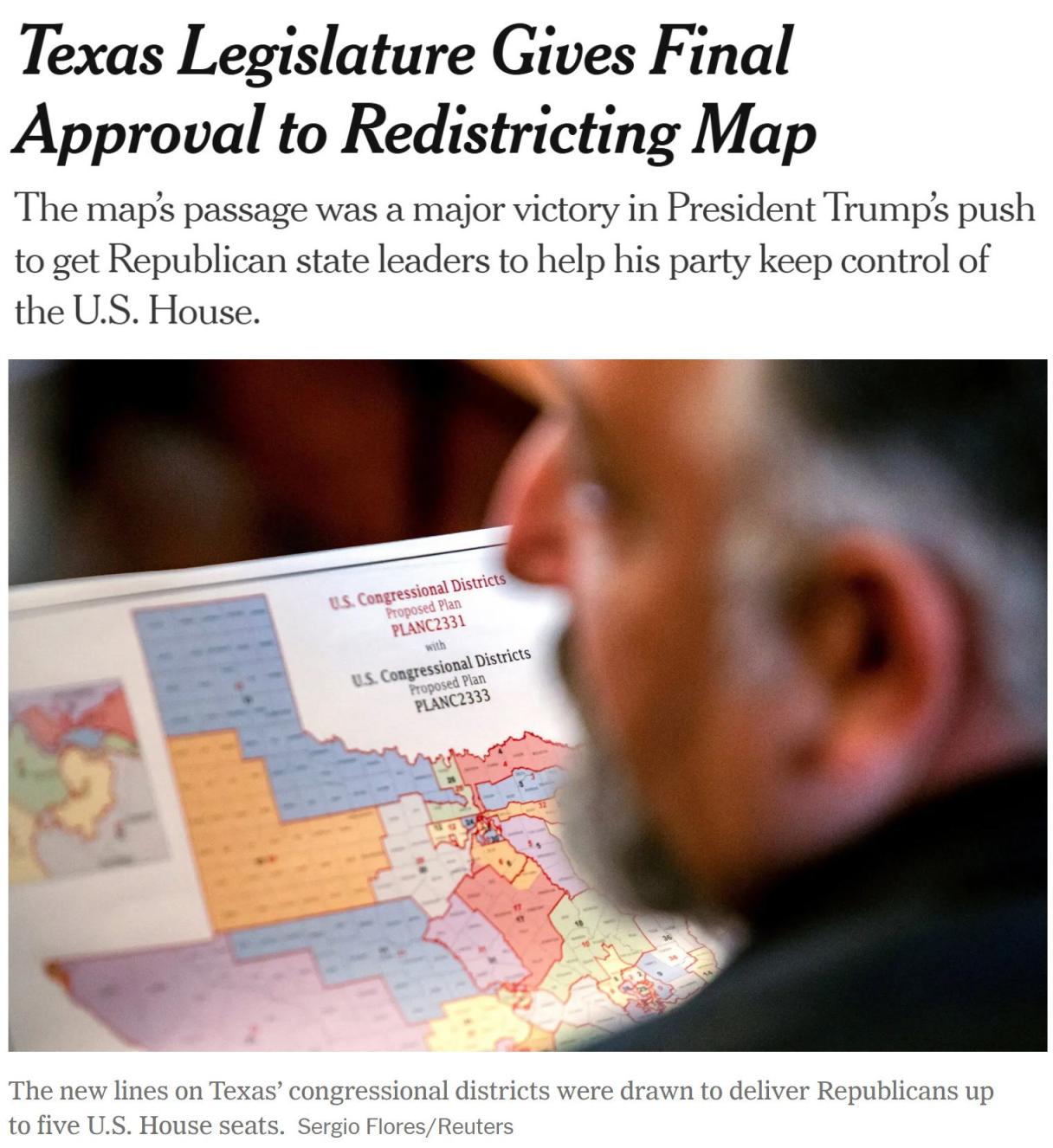 得州共和党2021年主导重划选区。目前该州38个国会众议院席位中,共和党占25席。但是从其后的选举来看,并没有达到共和党重划选区的目的,州内的共和党支持者所占比重和共和党在该州赢得的众议院席位并没有完全匹配。 因此得州希望通过再次重划选区进一步扩大共和党在该州的优势,从而在明年中期选举中巩固共和党在国会众议院的多数席位。 目前,共和党在国会众议院仅以219席比212席占据微弱优势。因为如果民主党在中期选举中“翻盘”,会对共和党籍总统特朗普的执政不利。