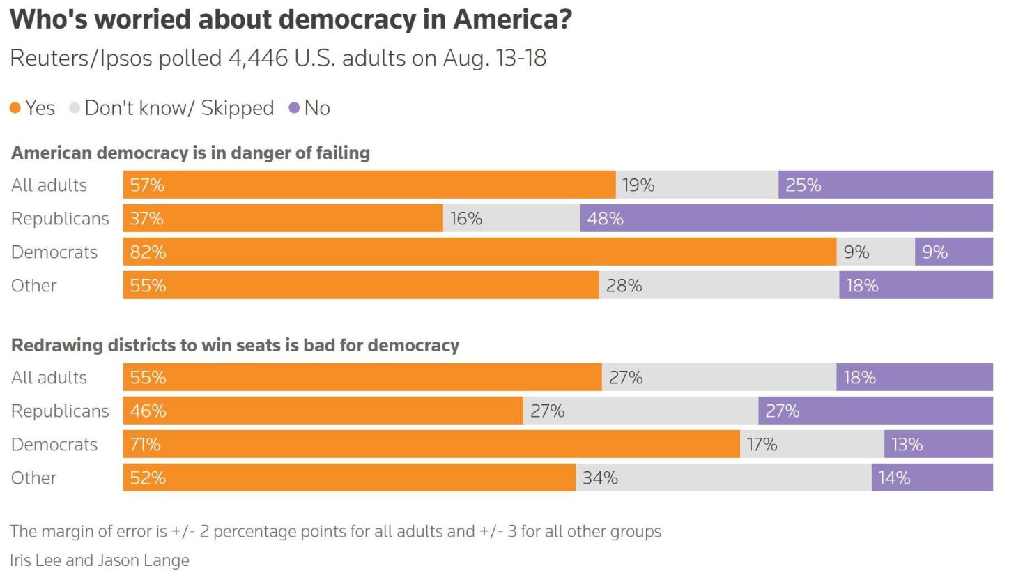 路透社和民调机构益普索公司日前发布的一项民调结果显示,57%的受访者担心美国民主正处于危险之中,55%的受访者认为为谋取政党利益而重新划分国会选区的做法不利于国家的民主。
